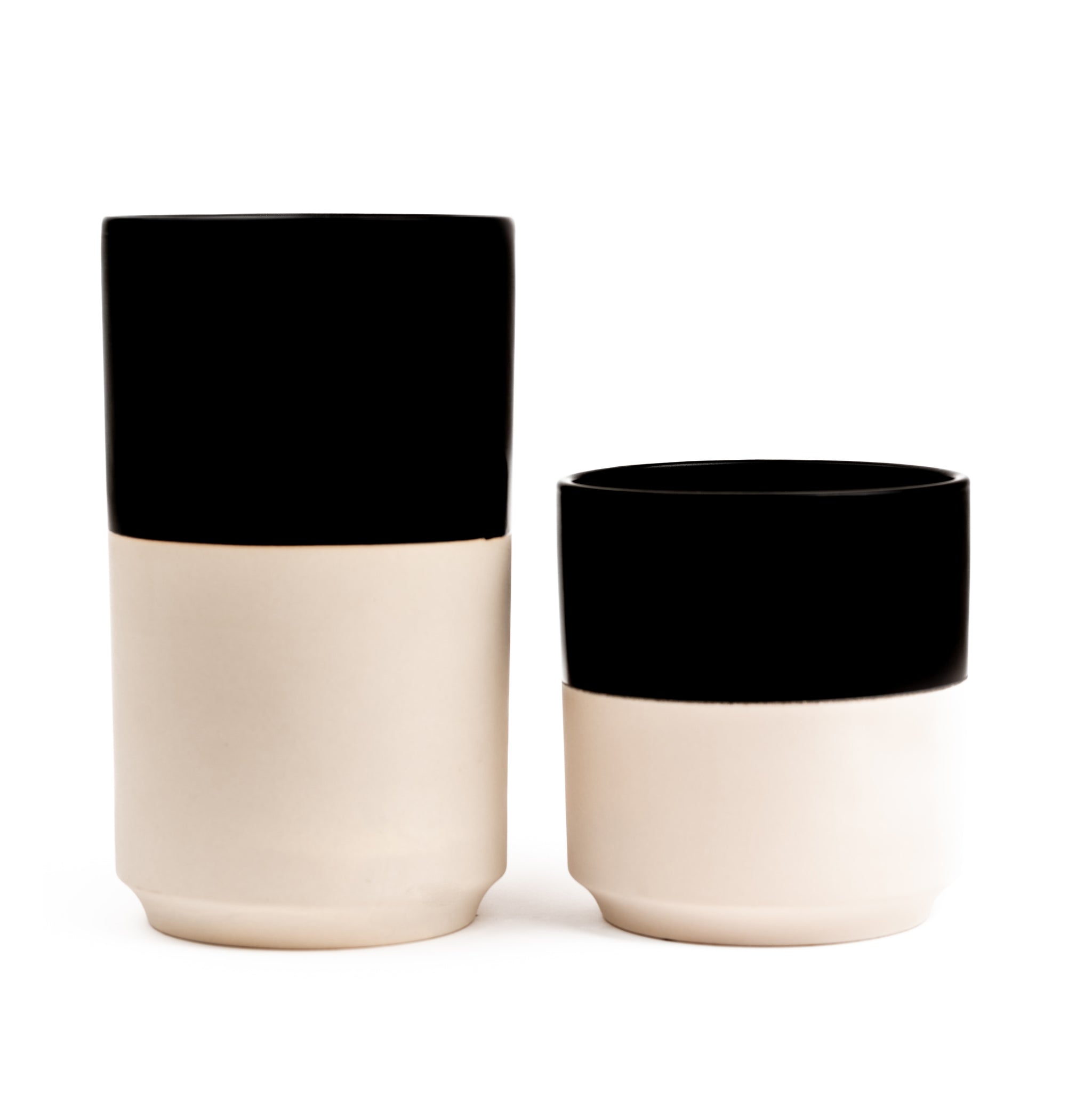 Sleek and sturdy one-of-a-kind shapes are fashioned from high-quality porcelain. This modern, high-contrast, two tone design is a great addition to any decor. Black evokes sophistication and contrasting white gives it a classic, bright aesthetic.